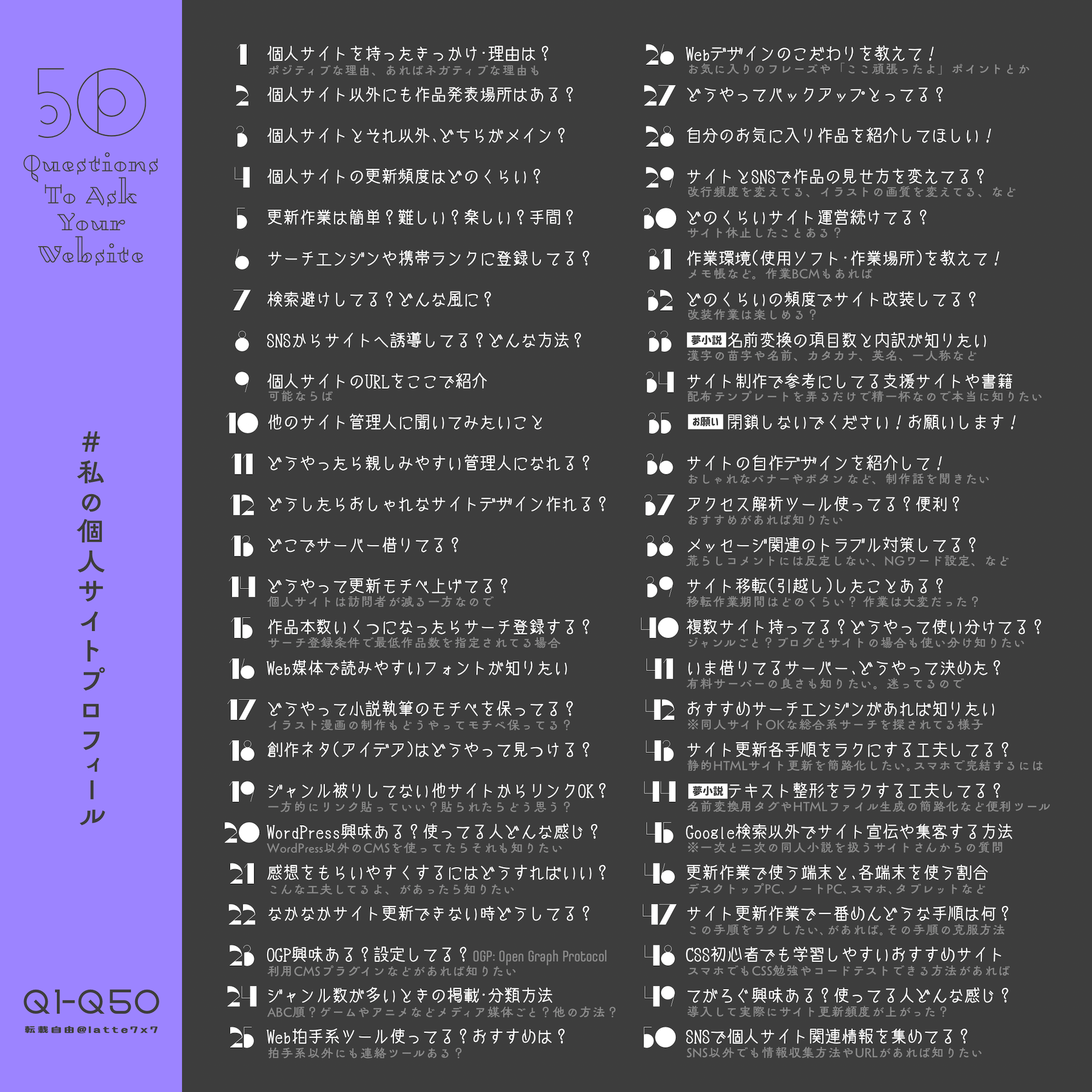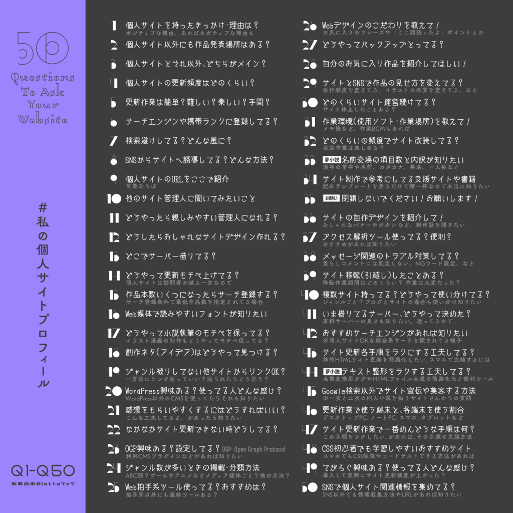 新年に暇を持て余し、こちらのサイトの50の質問に答えることにした。